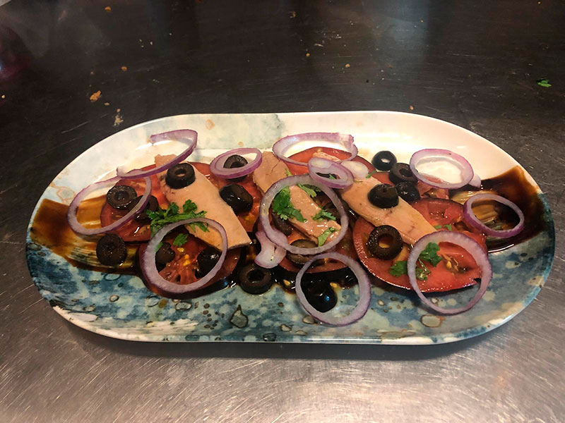 Con salmón, bacalao, anchoas, tomate cherry y cebolla crunchy