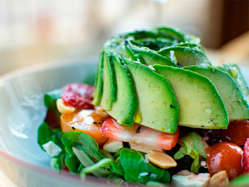 Con queso feta, tomates cherry, aguacate, cacahuetes y fresa